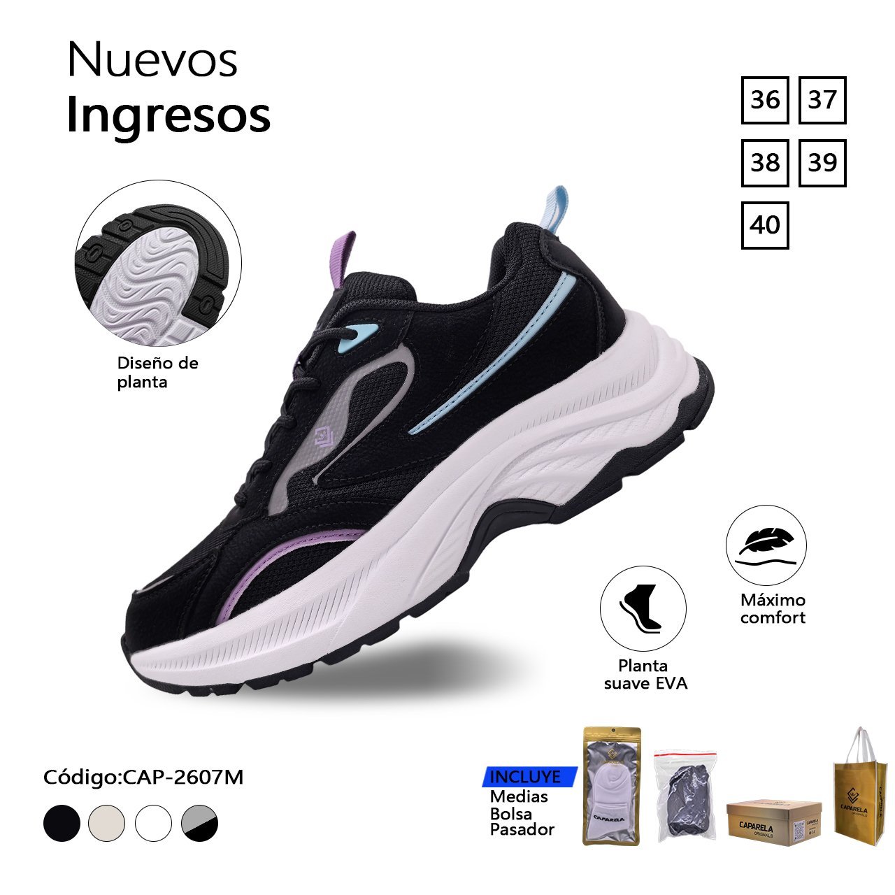 Plantilla suave con buena absorción de impacto al caminar, tiene suela flexible con tracción segura y materiales transpirables que mantienen el pie fresco.